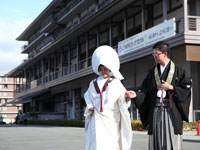 <挙式のご感想をお聞かせくださいませ> 12月初旬ということで、大イチョウが見頃の西本願寺。 晴天に恵まれ、美しい黄金色に輝くイチョウをバックに記念撮影が出来ました。 式直前、お鬘の中で頭が痛くなった時も、スタッフの方々が素早く対処してくれた おかげで、そのあと快適にすごせました。