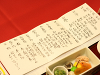 <担当プランナーへメッセージがございましたら、ご記入をお願い申し上げます> 担当Nさん。当日はもしかしてこれないかもしれないと言われたのですが、直前にサポートして頂けると分かったときは、Tさんに感謝しました。Nさんのおかげで心に残る素敵な一日を迎える事ができました。 私の仕事が忙しい中の準備も、Nさんがお仕事お休みの中出てきて下さって、色々なわがままを聞いて下さった事に感謝します。素敵なNさんに出会えて、こうして披露宴も無事に終えられた事、私には一生の思い出です。 両親も、とっても感動したと喜んでくれて、プランナーさんから、仲居さん、そして女将さん皆さんの心配りがとてもよかったね。と言っていました。本当にありがとうございました。